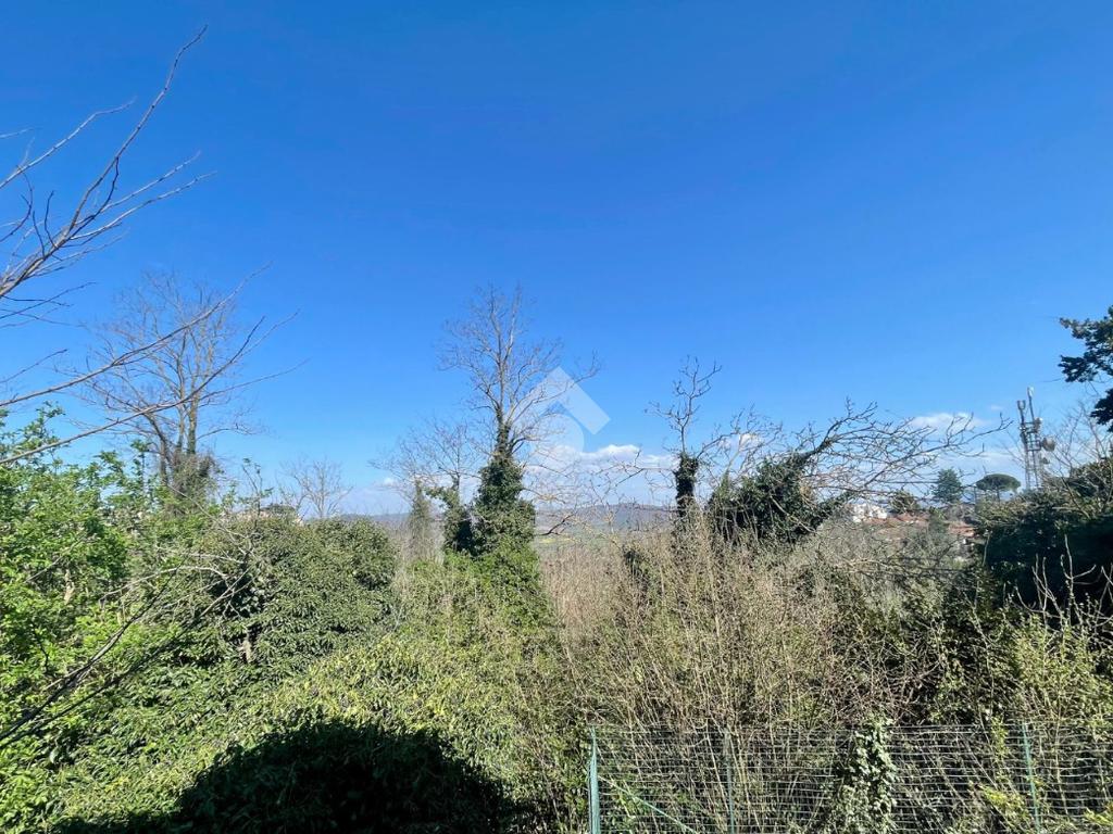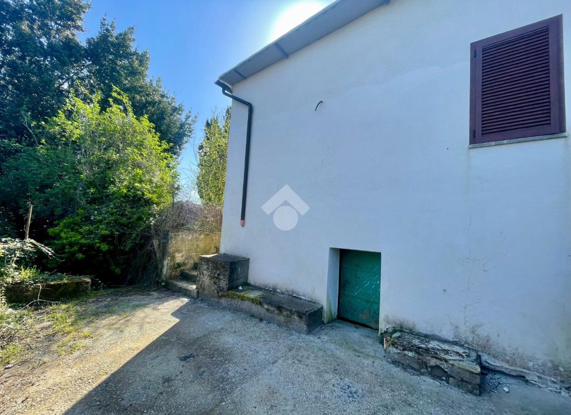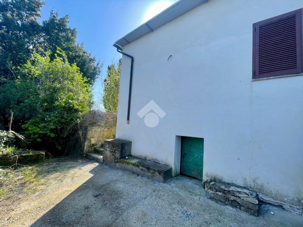 Da ingresso pedonale si accede all'area che costeggia l'abitazione , lo spazio esterno è parzialmente pavimentato , la parte restante è boschiva .